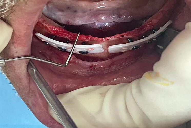 Uzyskaną przestrzeń wypełniamy drobnocząsteczkowymi przeszczepami kostnymi, najlepiej wymieszanymi z kością własną pacjenta.