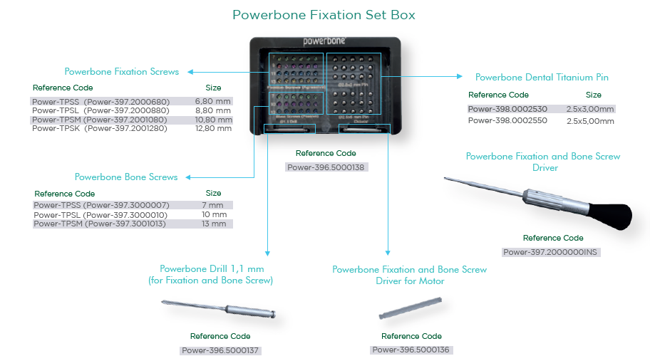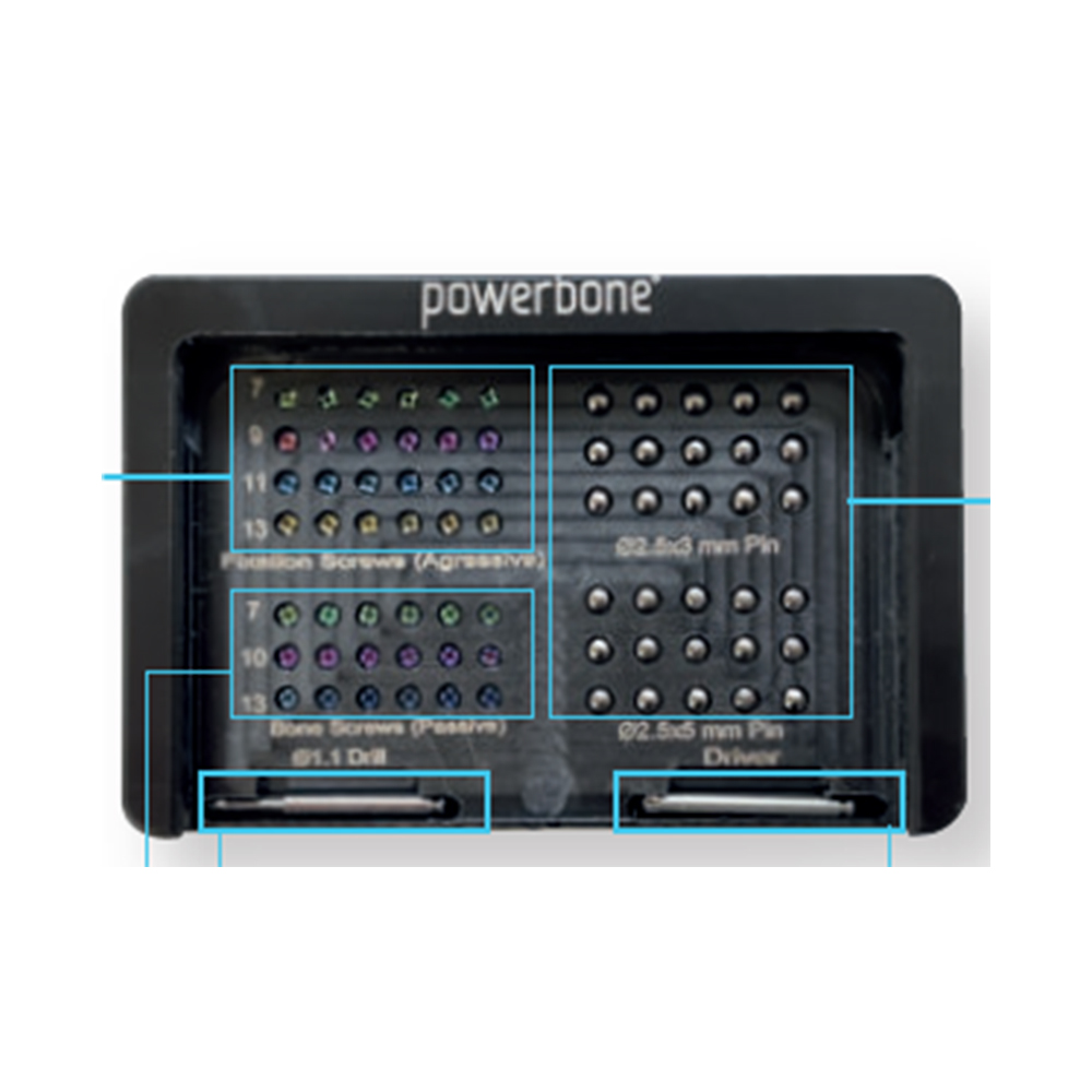 Zestaw narzędzi do pinowania membran oraz stabilizacji bloczków kostnych. Śruby oraz piny wykonane są z tytanu (Grade 5).